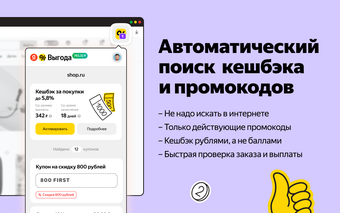 ياندكس فيغودا هو ملحق في فايرفوكس يعزز التسوق عبر الإنترنت من خلال العثور تلقائيًا على قسائم الخصم الصالحة وتقديم مكافآت نقدية. يدعم أكثر من 500 متجر إلكتروني شهير في روسيا، مما يضمن للمستخدمين الوصول إلى أفضل العروض. يعمل الملحق من خلال التحقق من رموز الترويج المدخلة تلقائيًا ويدويًا، مما يجعله أداة موثوقة للمتسوقين الأذكياء الذين يتطلعون إلى توفير المال.